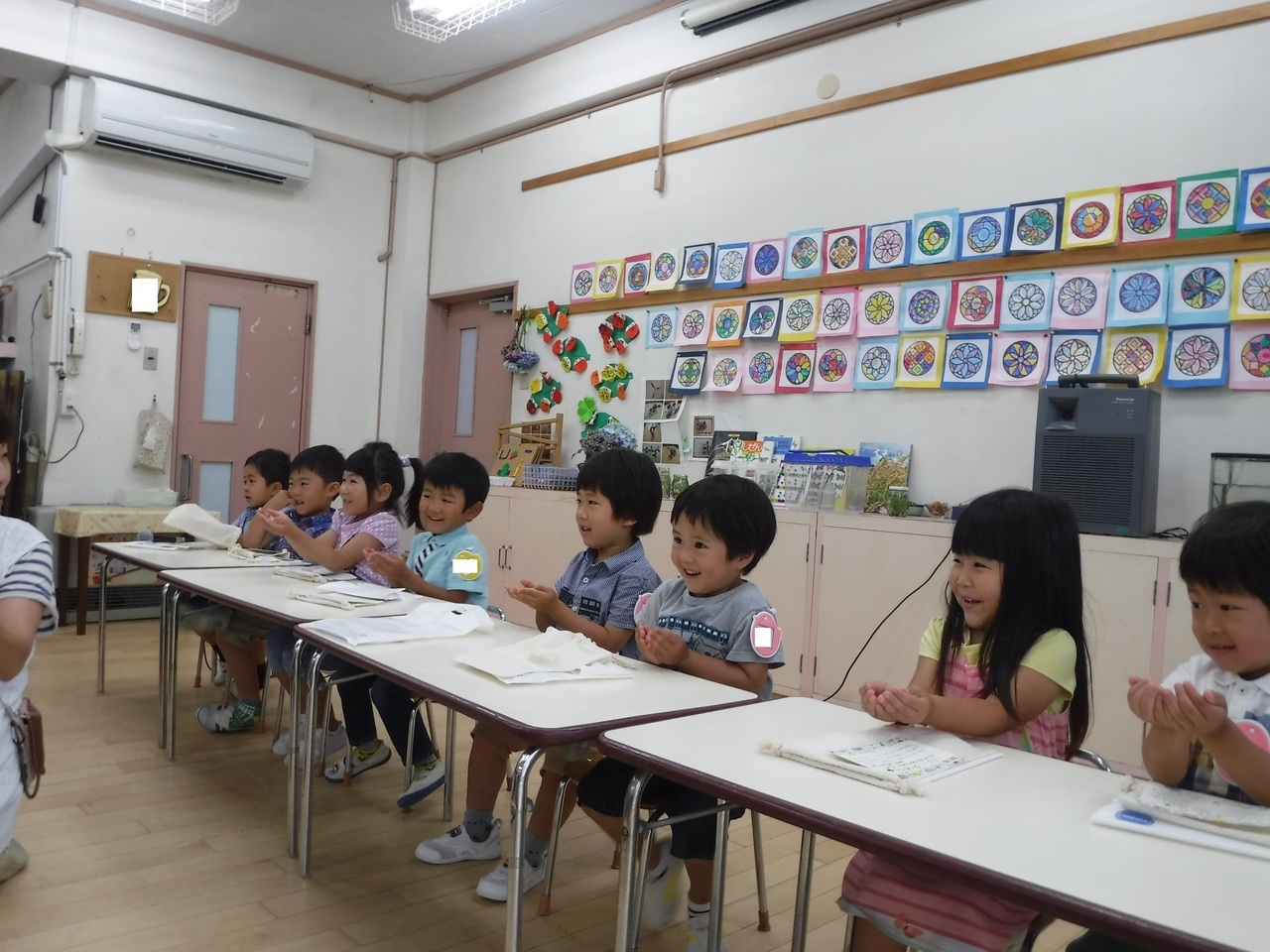 月に1回、3クラス合同で行います。お誕生児のおうちの方をお招きし、みんなでお祝いします。茶話会でケーキもいただきます。